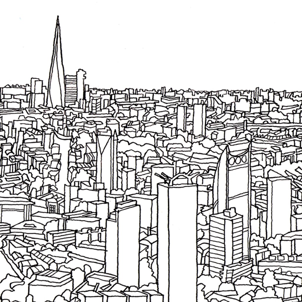 The image started with a double A4 sketch to get a feel for the composition and how much foreground detail might be needed before the city merged into a pattern towards the horizon. The final drawing took around 3 full days of careful pencil work, using a combination of personal memory (every street and landmark brought back memories of living and cycling here for over 20 years!) and then 2 full days of inking to bring out the detail and to make sure it would translate when enlarged by a factor or around 4. I tested a few parts at the enlarged scale to make sure it would still be legible from distance whilst retaining a sharpness close-up.