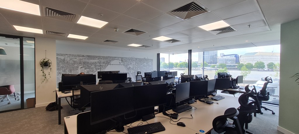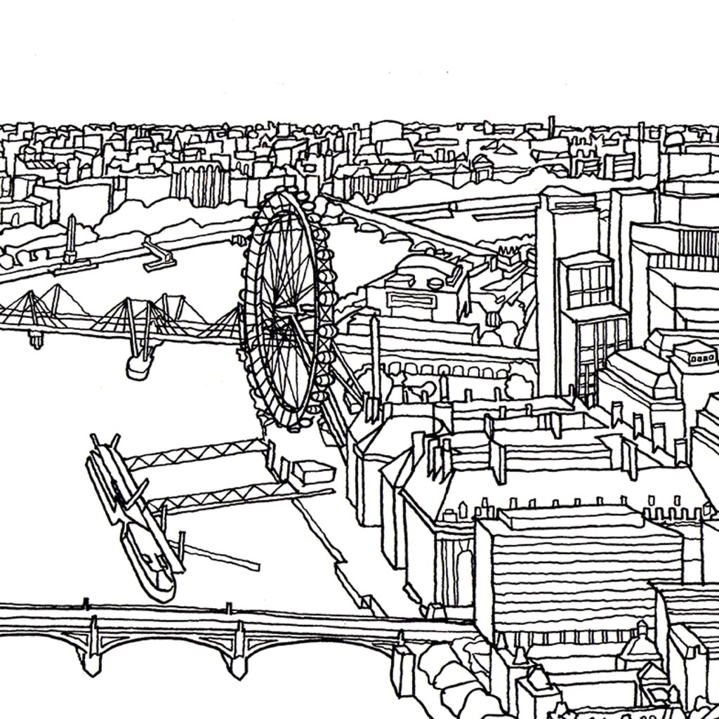 I was delighted to be asked to draw an aerial view over the Thames for Rethink Mental Ilnness who have relocated and wanted to capture their former elevated view to take along with them into their new offices. The finished drawing was converted into a 6.5m wide feature wallpaper that adjoins their new view across the river towards Millbank.